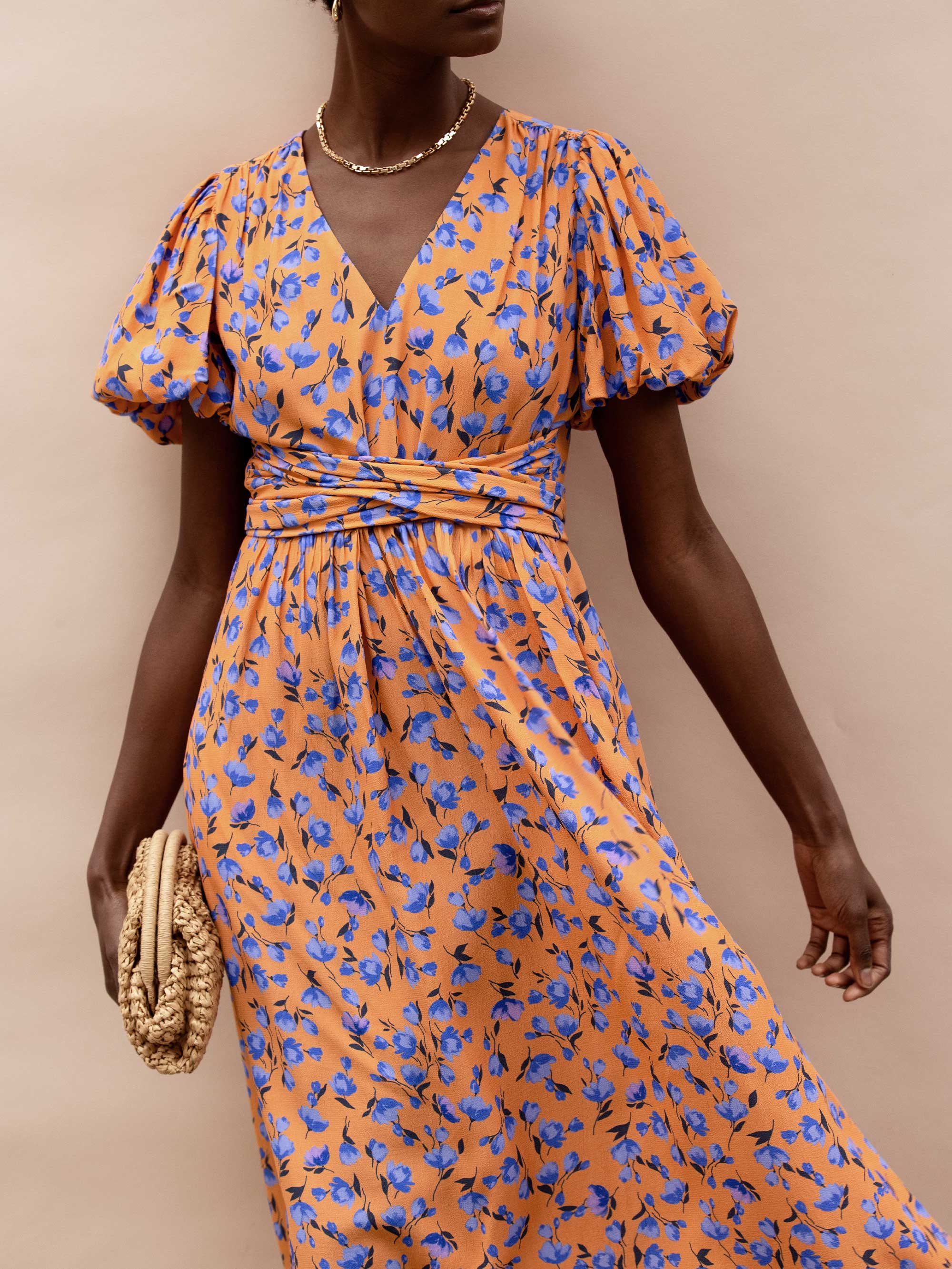 Orange And Blue Floral Puff Sleeve Dress