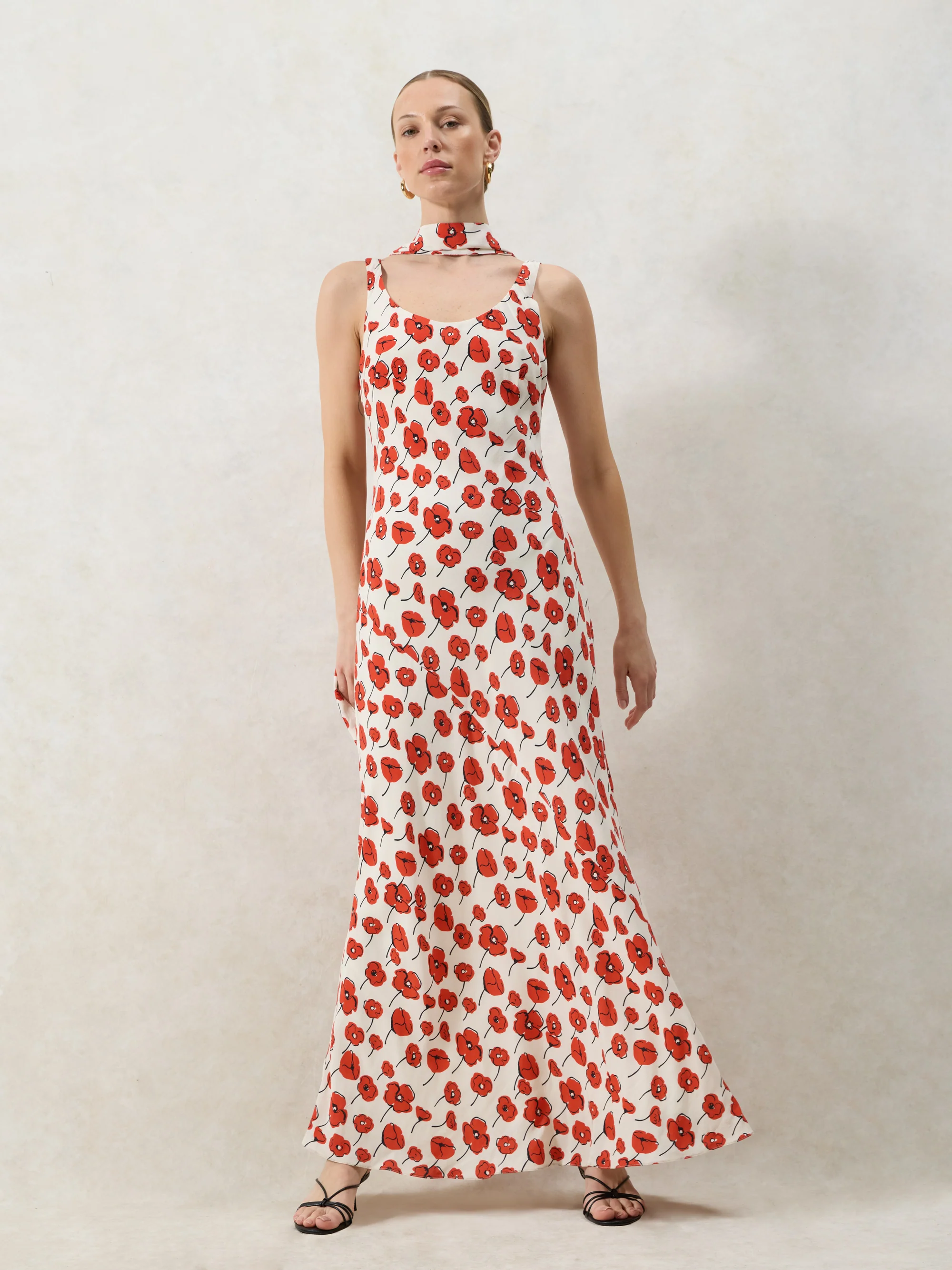 Ella Red Poppy-Print Scarf Detail Maxi Dress