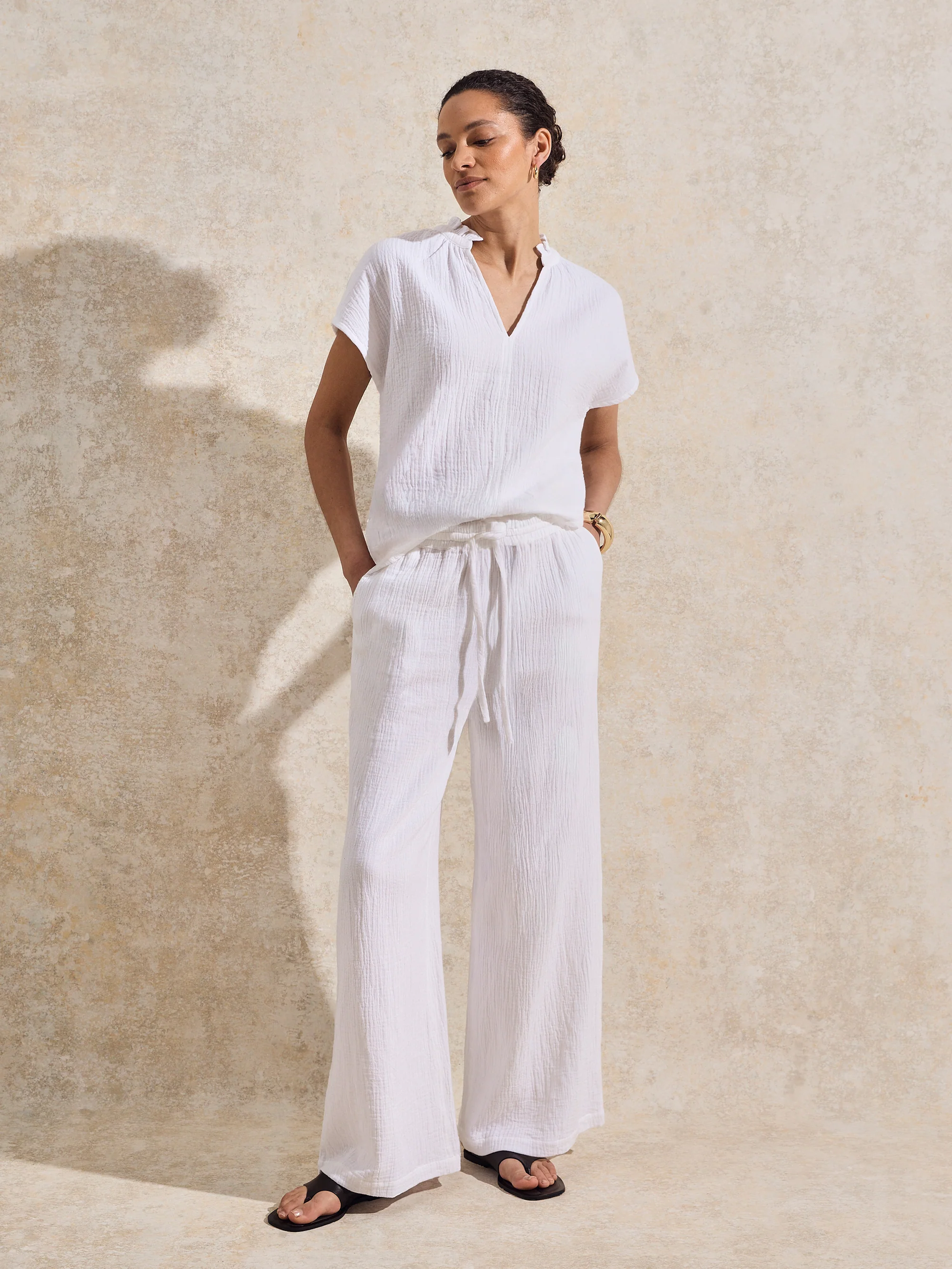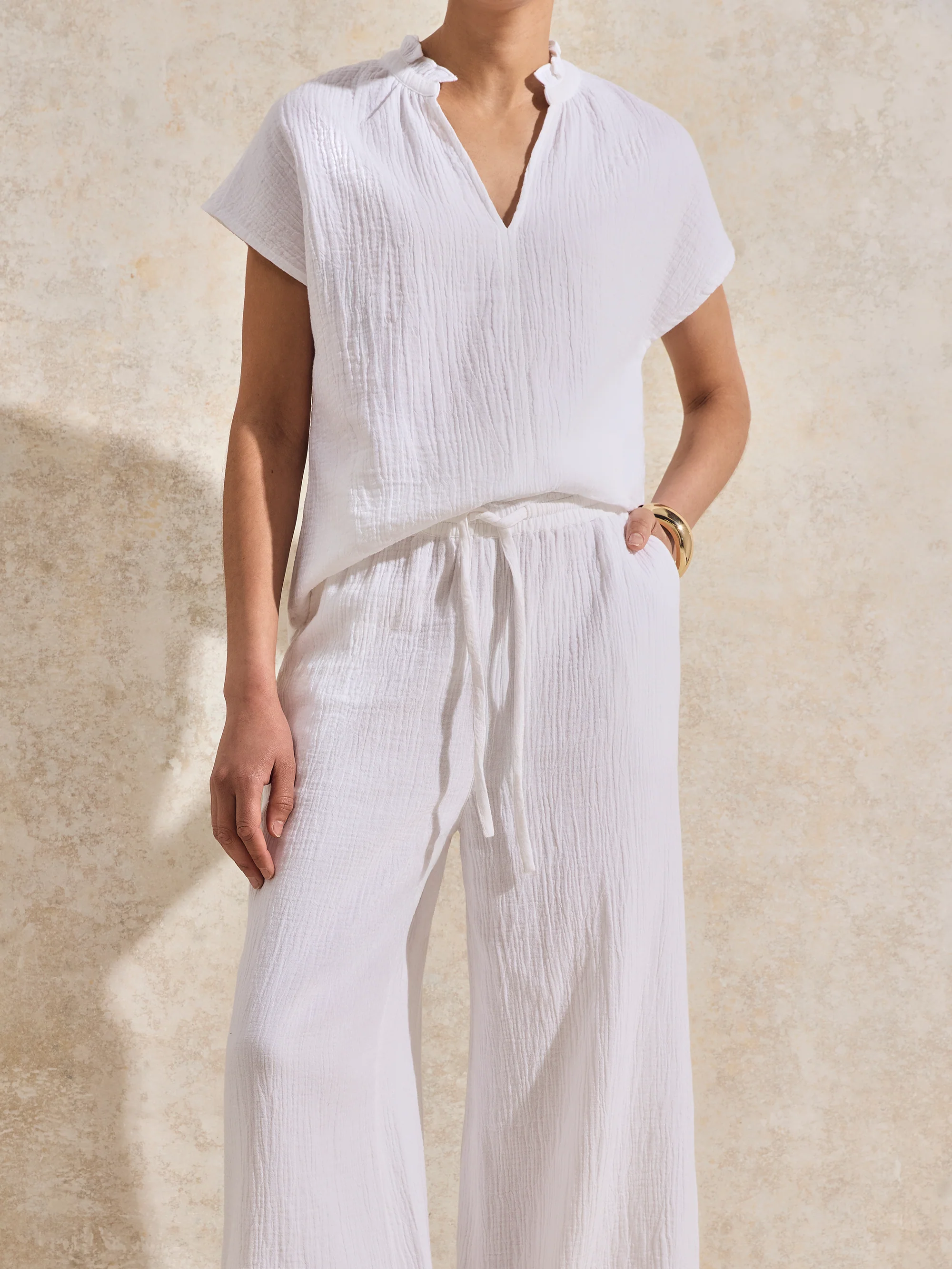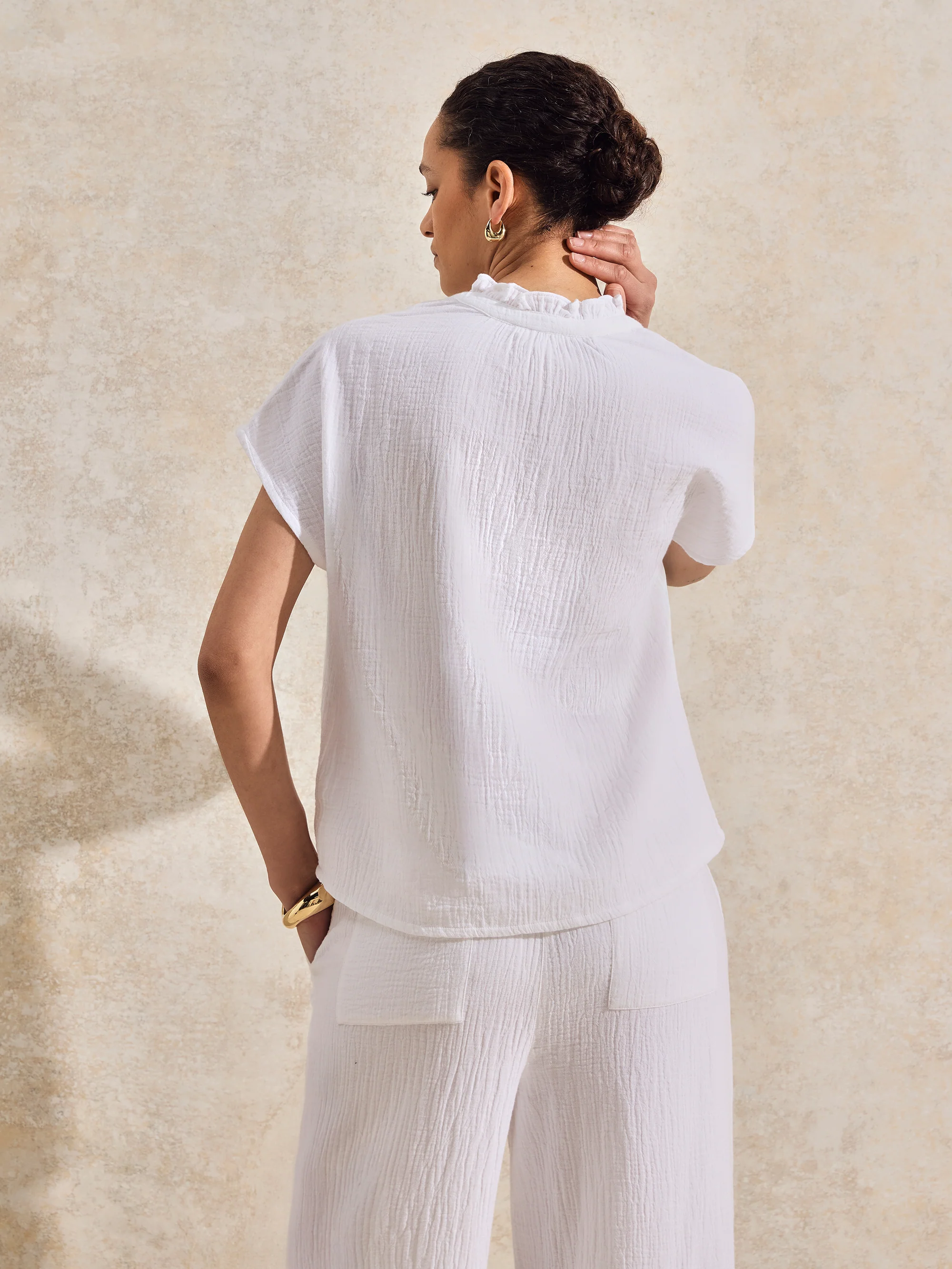 White Frill-Detail V-Neck Cheesecloth Top