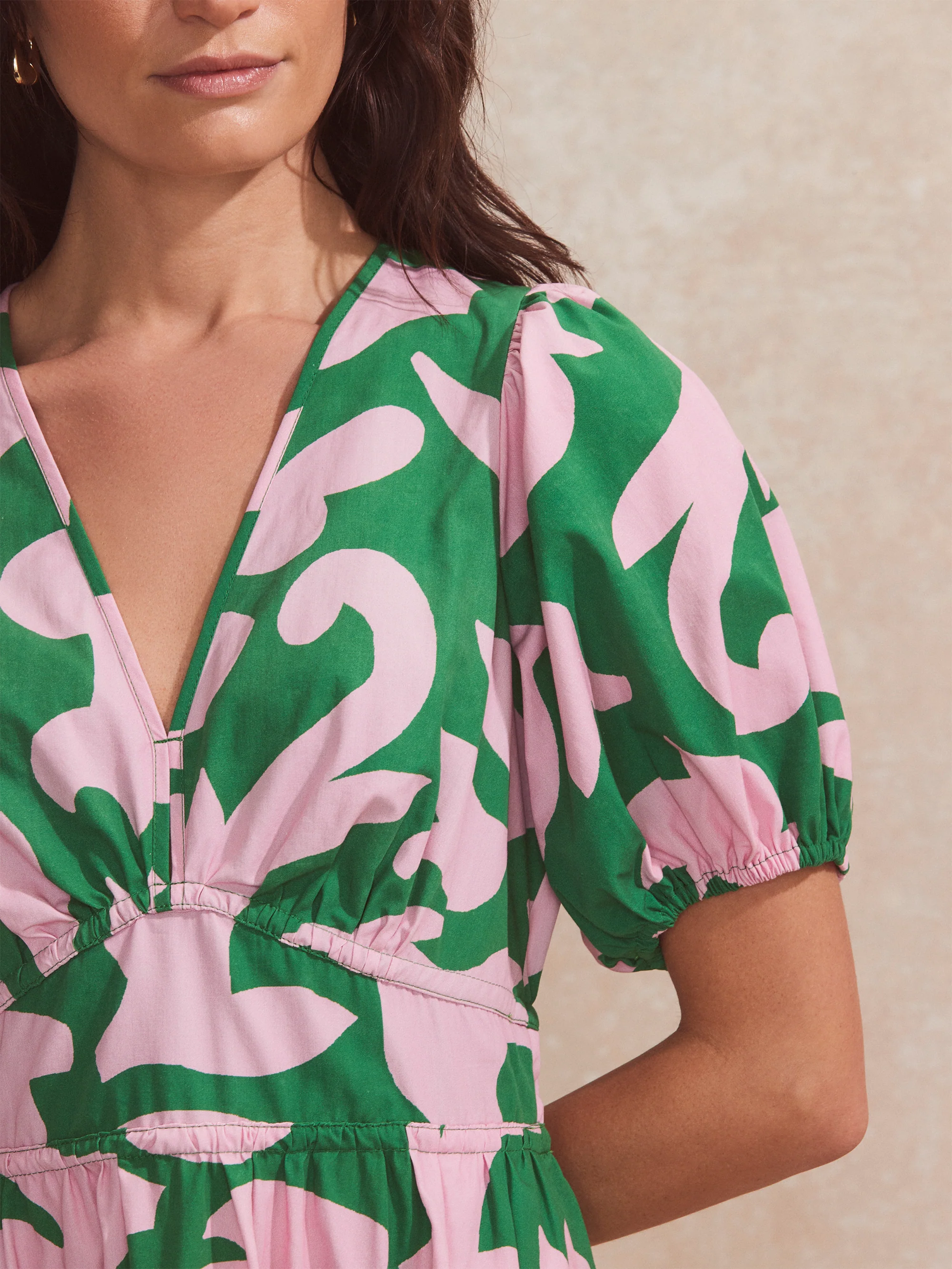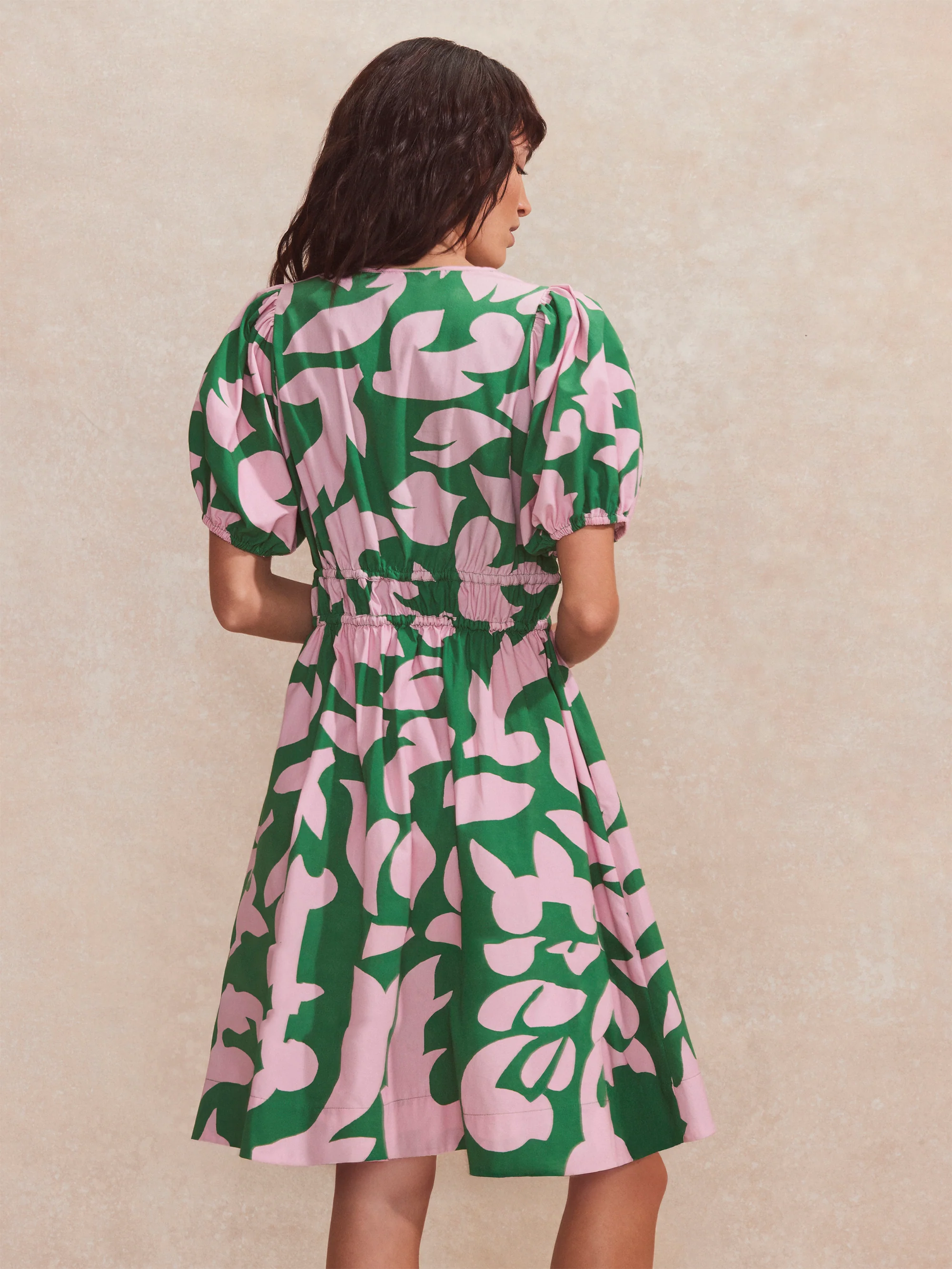 Pink and Green Abstract-Print Puff-Sleeve Mini Dress