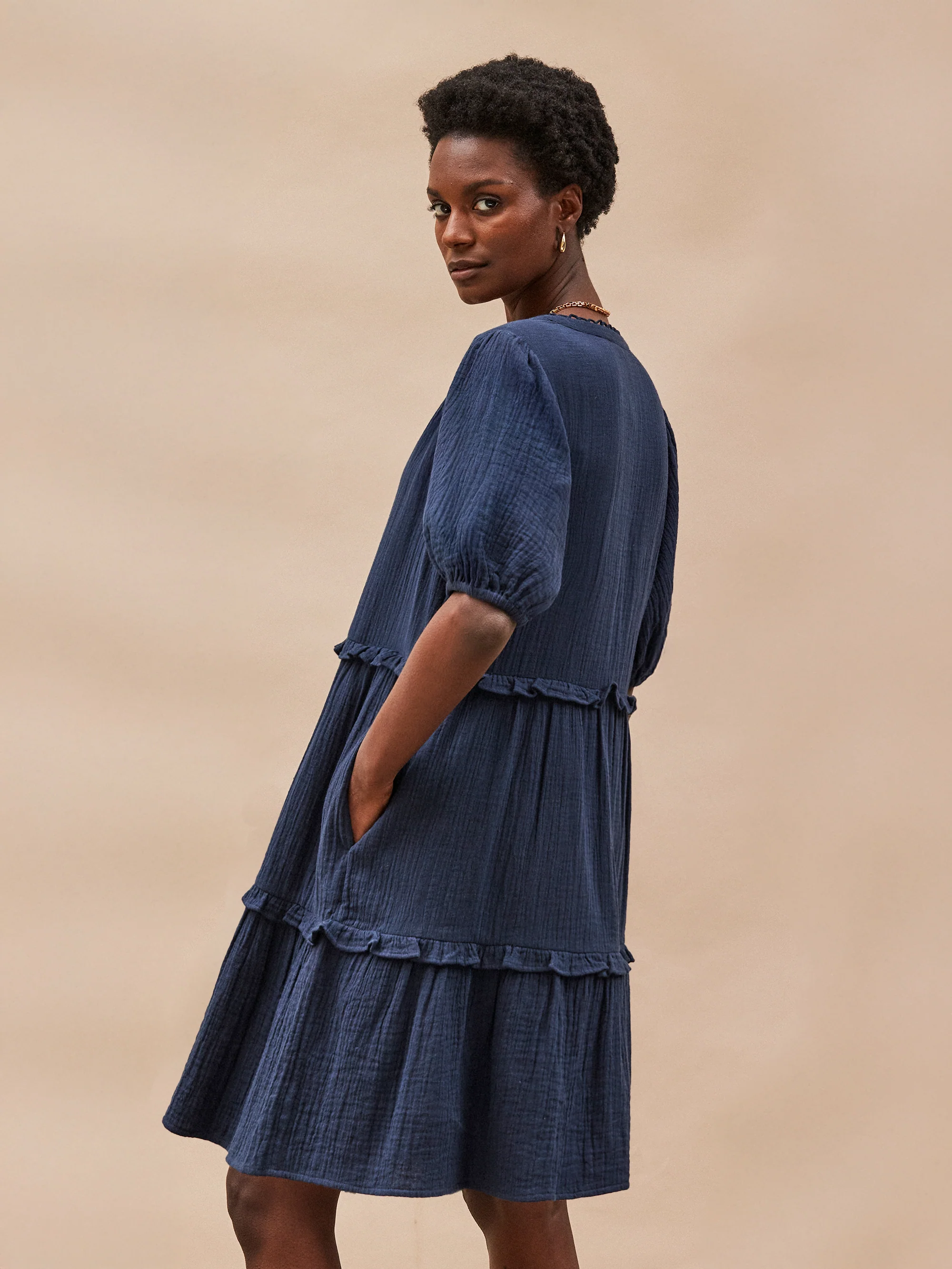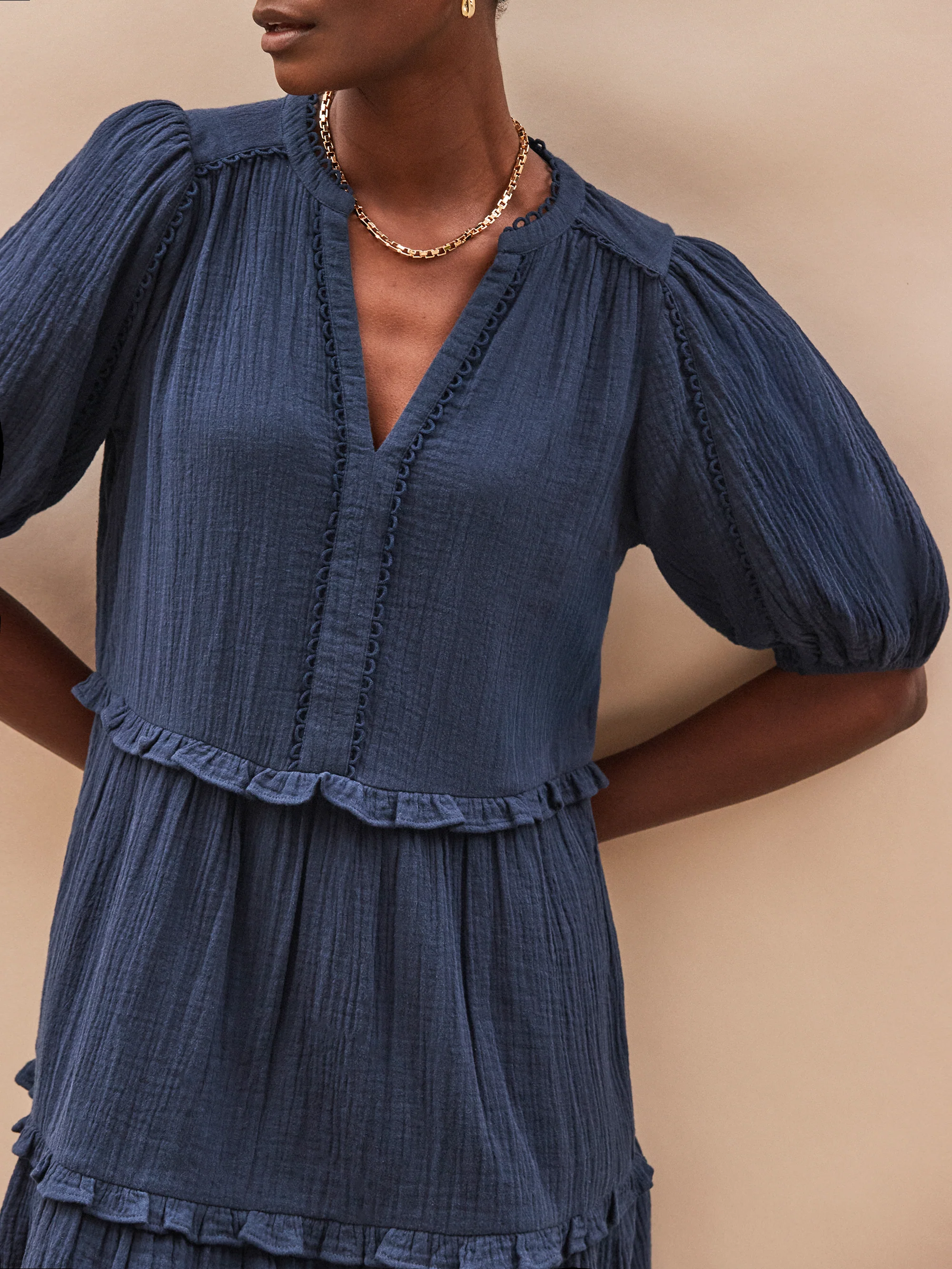 Navy Frill-Detail Cheesecloth Mini Dress