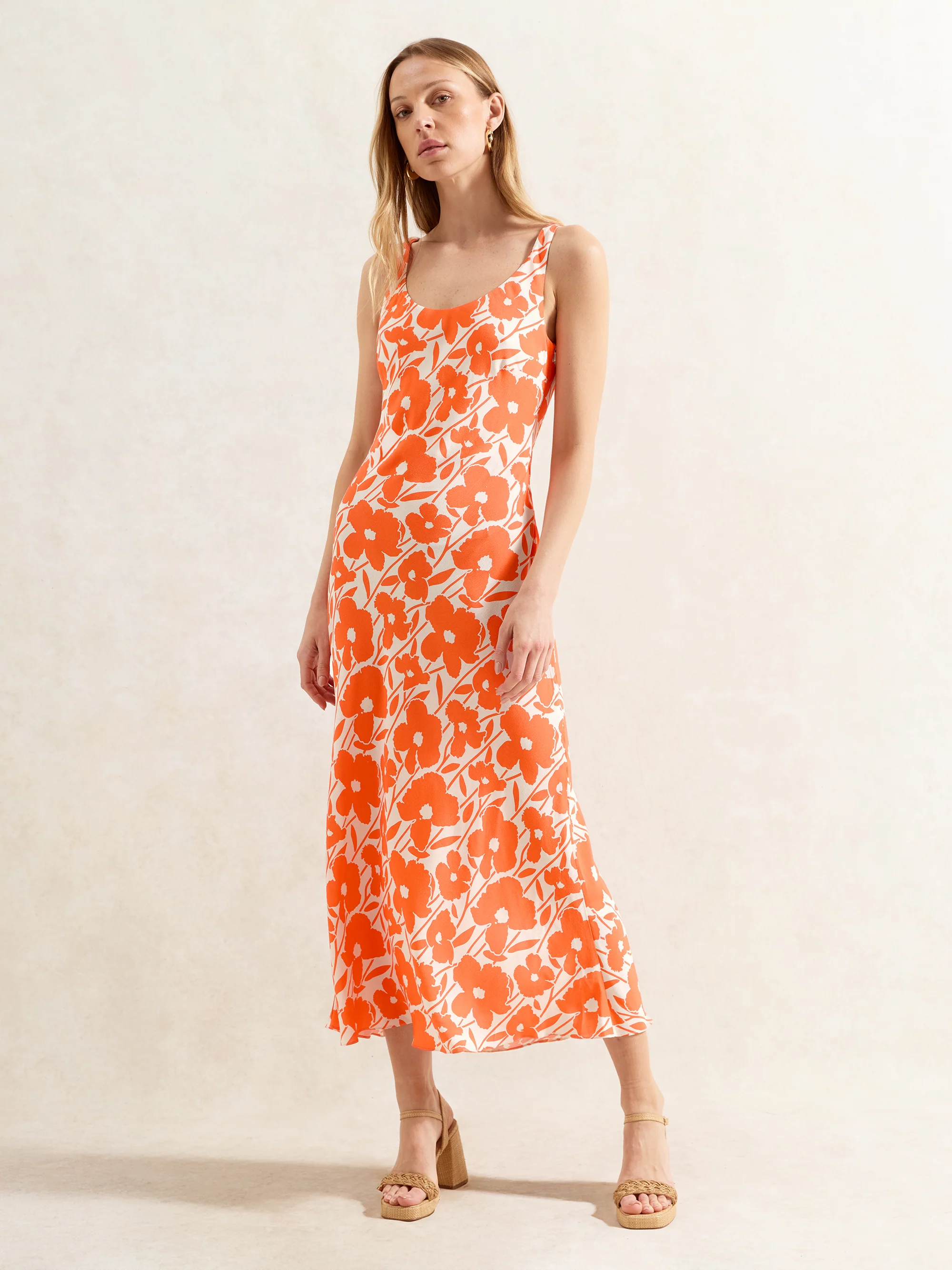 Petite Orange Poppy-Print Scoop-Neck Midi Dress